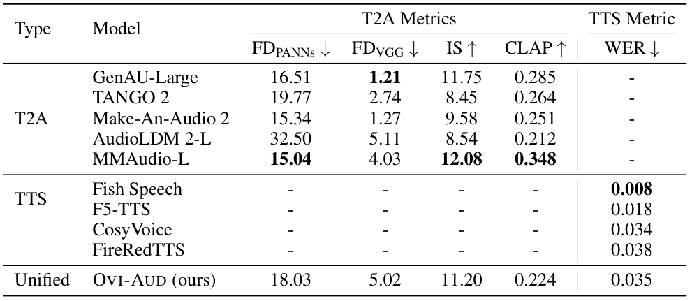 作为一个能够同时处理文本到音频(T2A)和文本到语音(TTS)的统一模型,OVI-AUD在各自的指标上,都实现了与那些专门为此任务设计的顶尖模型相当的性能。