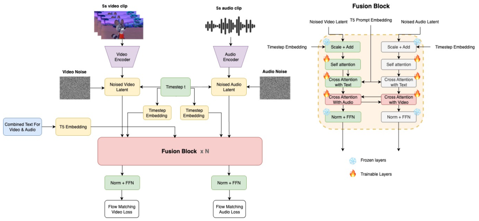 而音频分支,虽然是从零开始训练的,但其架构设计与视频分支完全一致,就像一对同卵双胞胎。