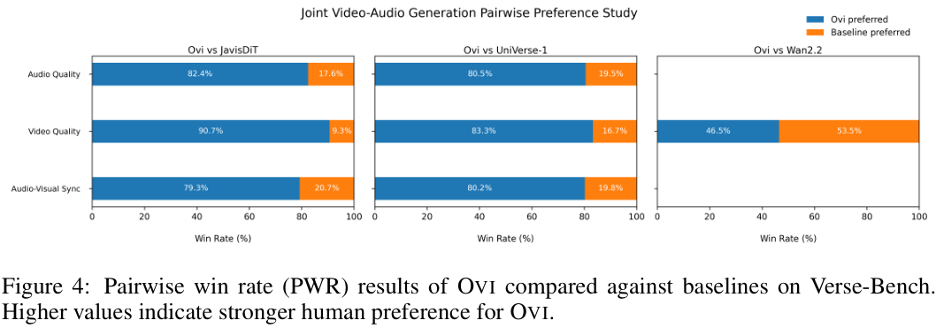 在Verse-Bench数据集上,无论是在音频质量、视频质量还是音画同步这三个维度上,参与者都压倒性地偏爱OVI的生成结果。