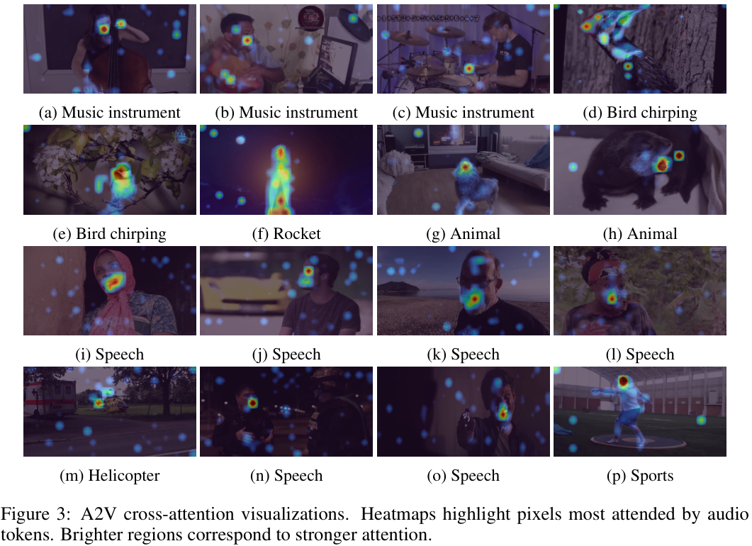 为了直观地展示OVI的学习效果,研究团队可视化了音频到视频(A2V)的交叉模态注意力图。