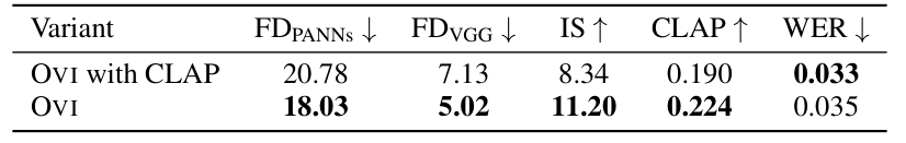 但重要的是,这种权衡是微小的,并不会削弱OVI在联合音视频生成任务中的整体优越性。