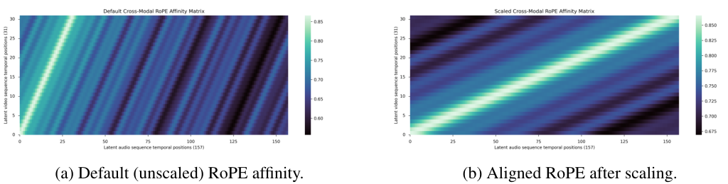 在没有进行RoPE缩放时,音频和视频的交叉关注矩阵在对角线上是错位的,信息无法有效同步。