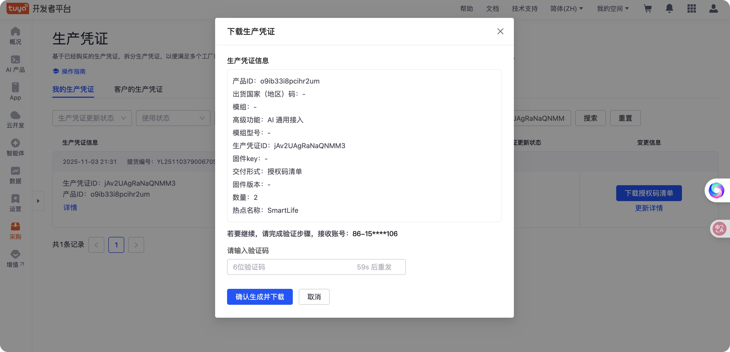 - 手机号码验证,点击「确认生成并下载」。