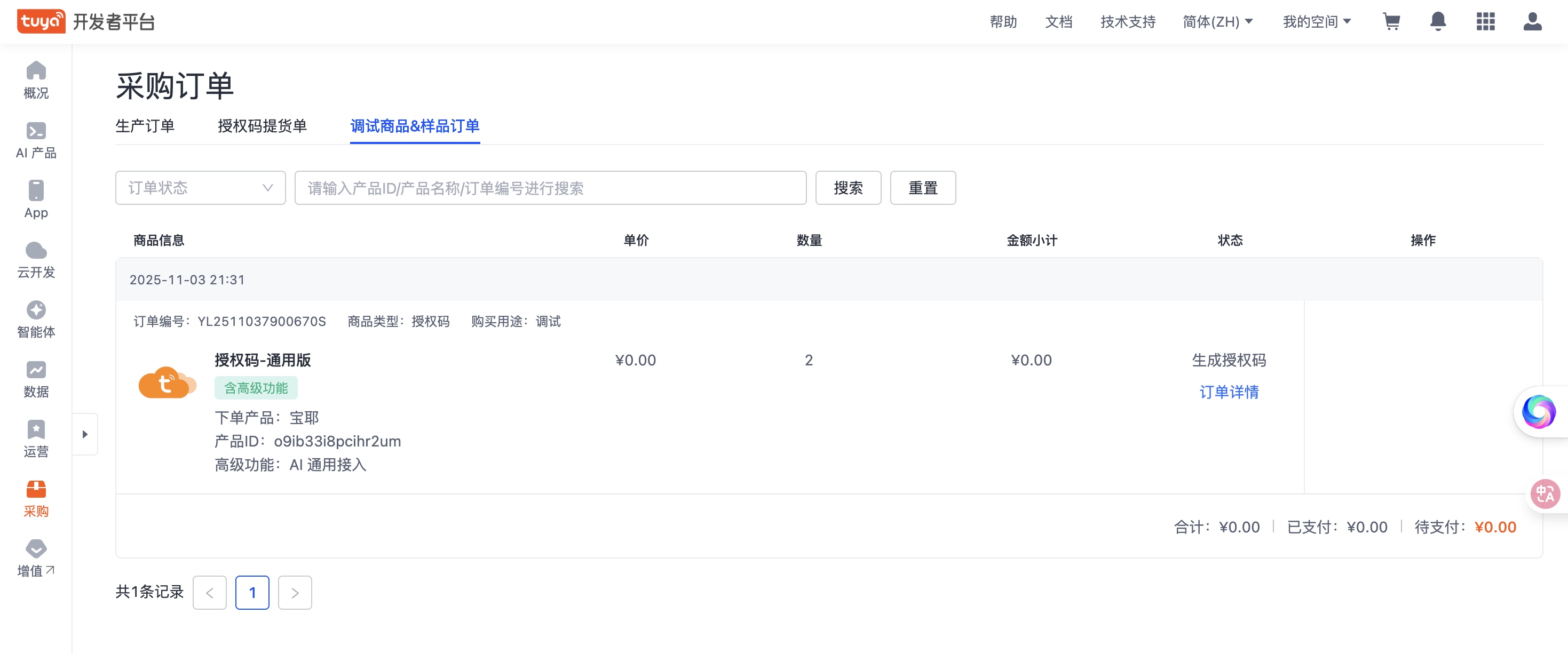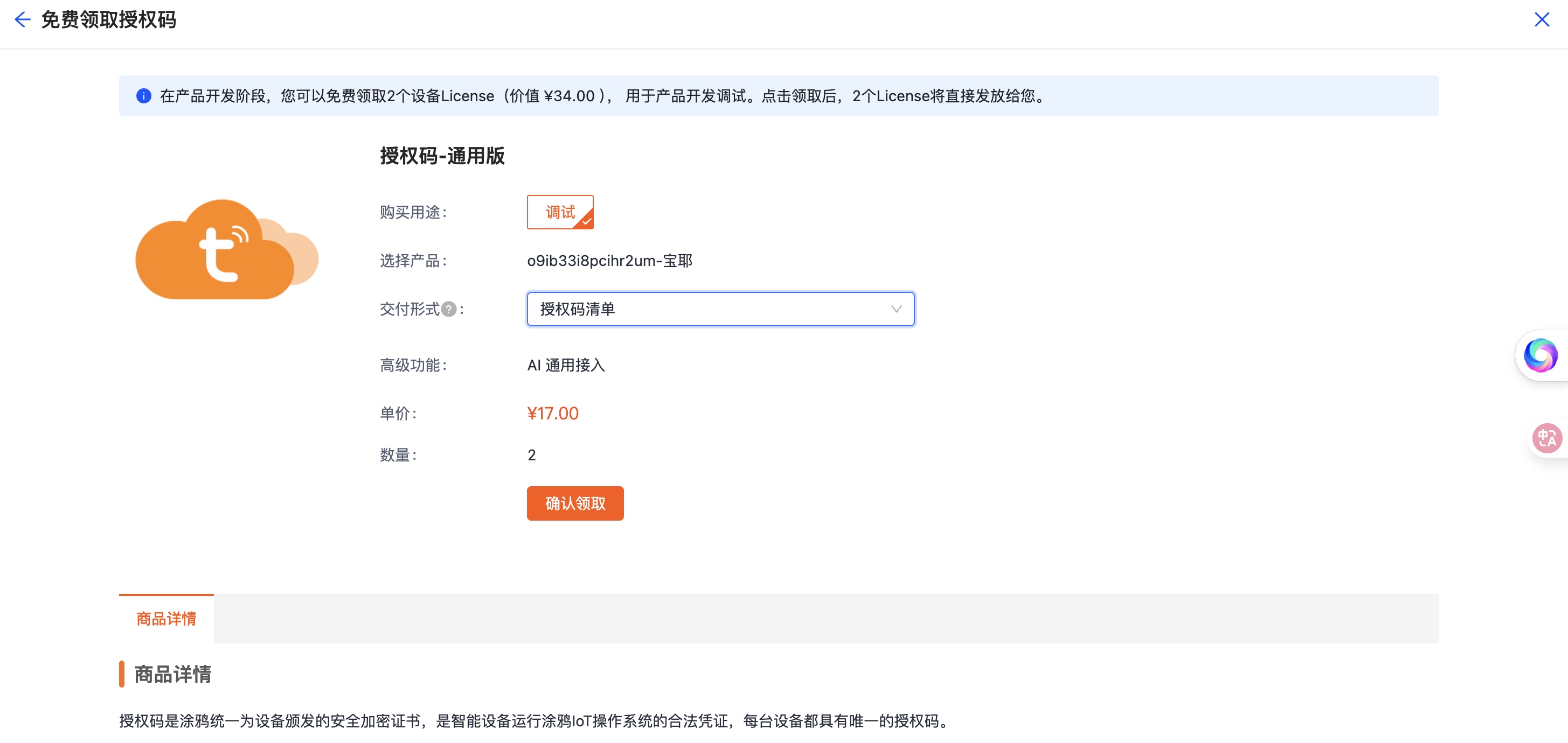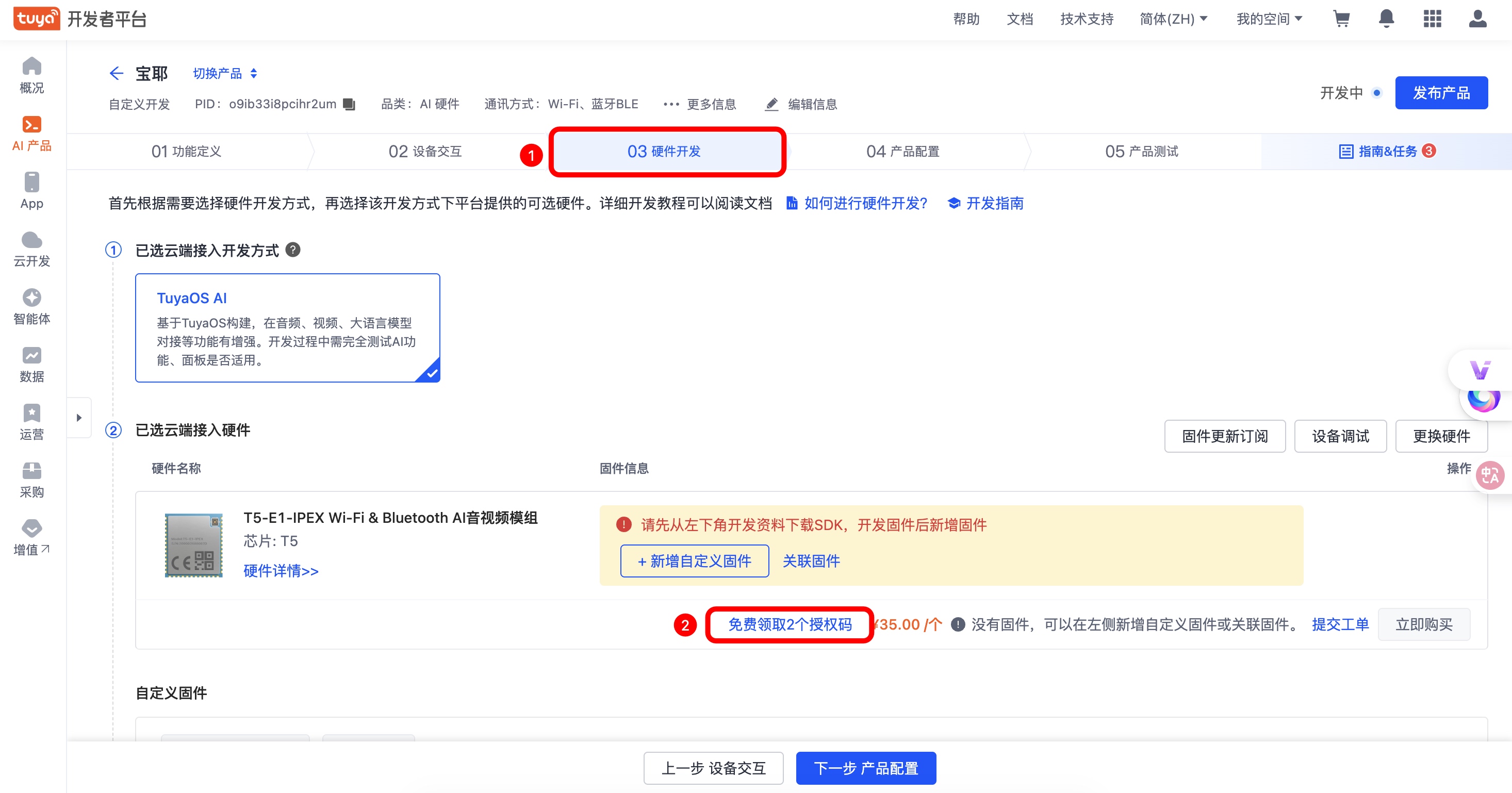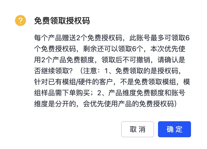 - 点击「硬件开发」,选择“免费领取2个授权码”。