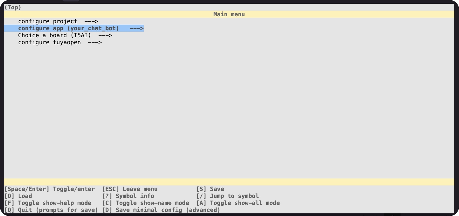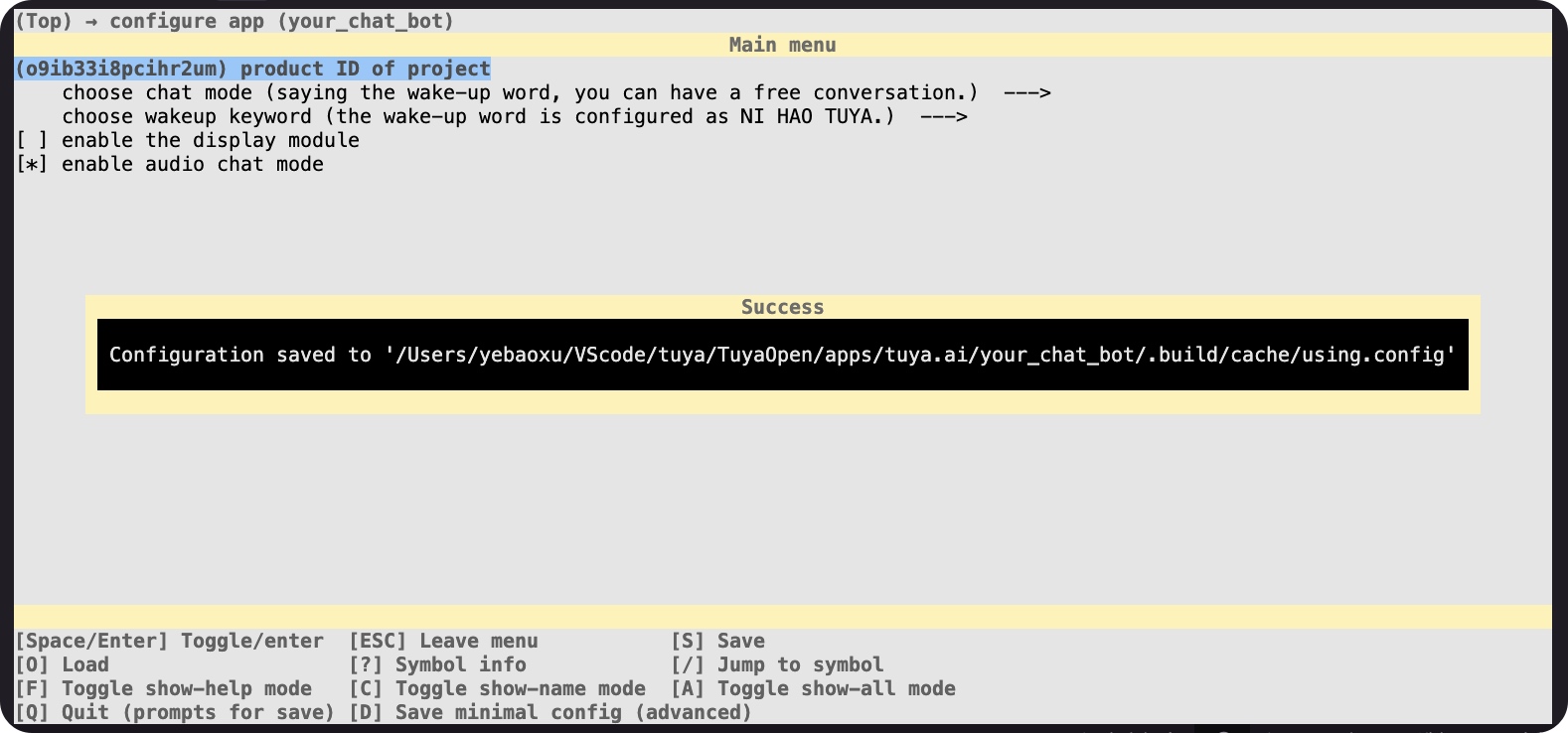 (venv) yebaoxu@yebaodeMacBook-Air your_chat_bot % ../../../tos.py config menu