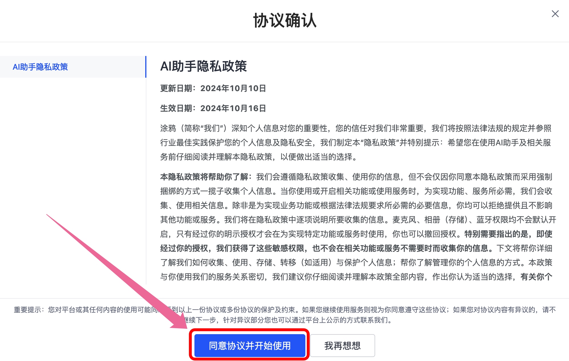 - 同意AI助手隐私政策协议并开始使用