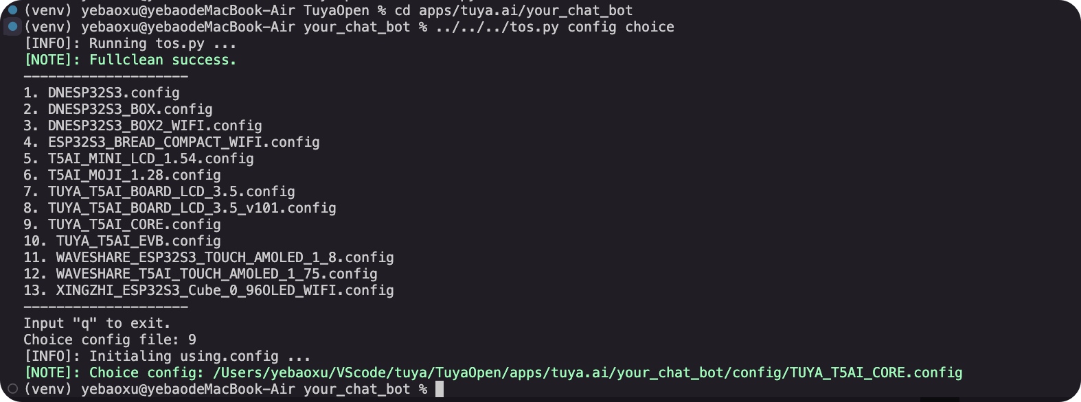 (venv) yebaoxu@yebaodeMacBook-Air your_chat_bot % ../../../tos.py config choice