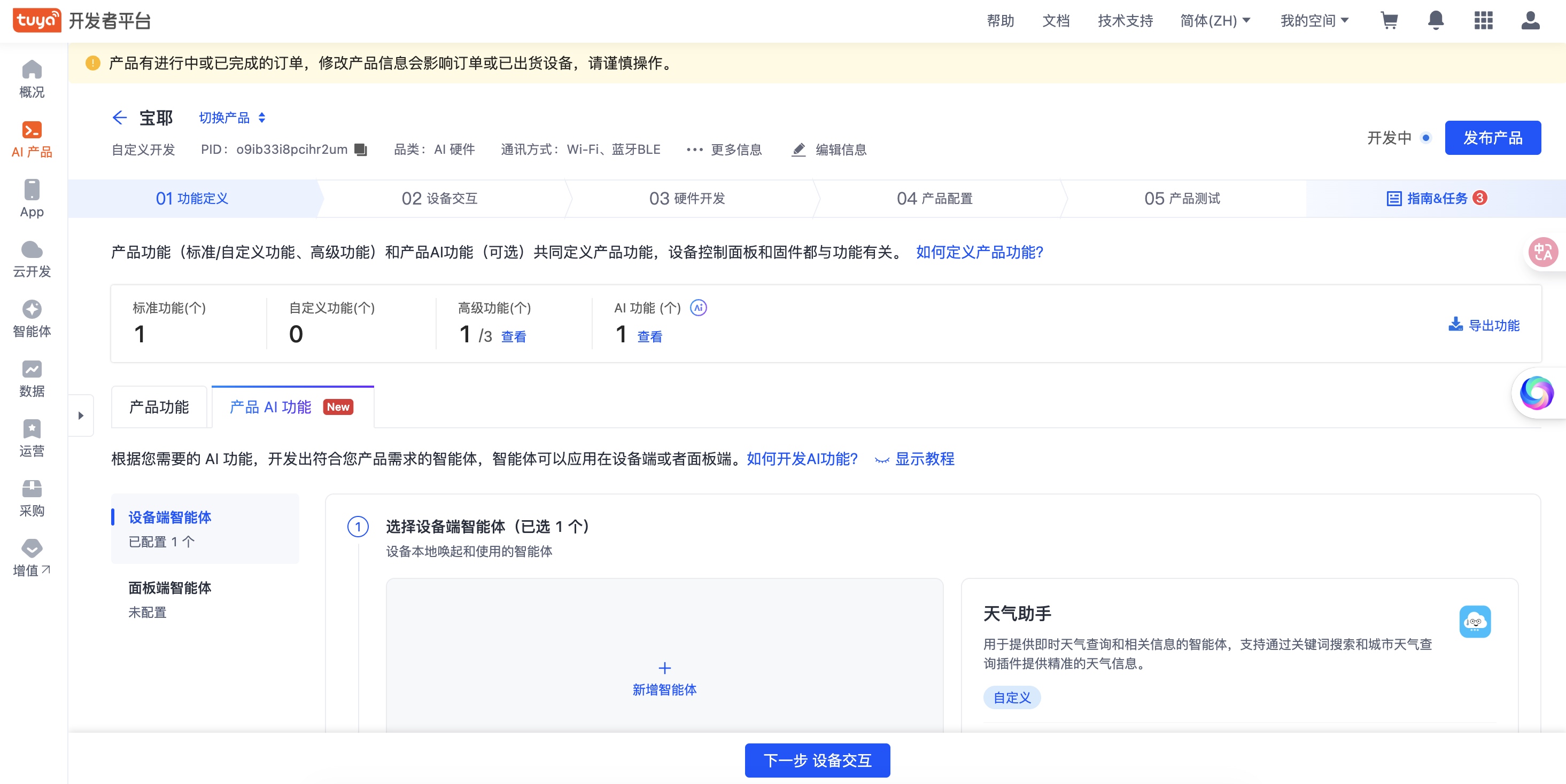 可以通过 产品开发 >功能定义 >产品 AI 功能 将此智能体添加到设备端智能体,如下图: