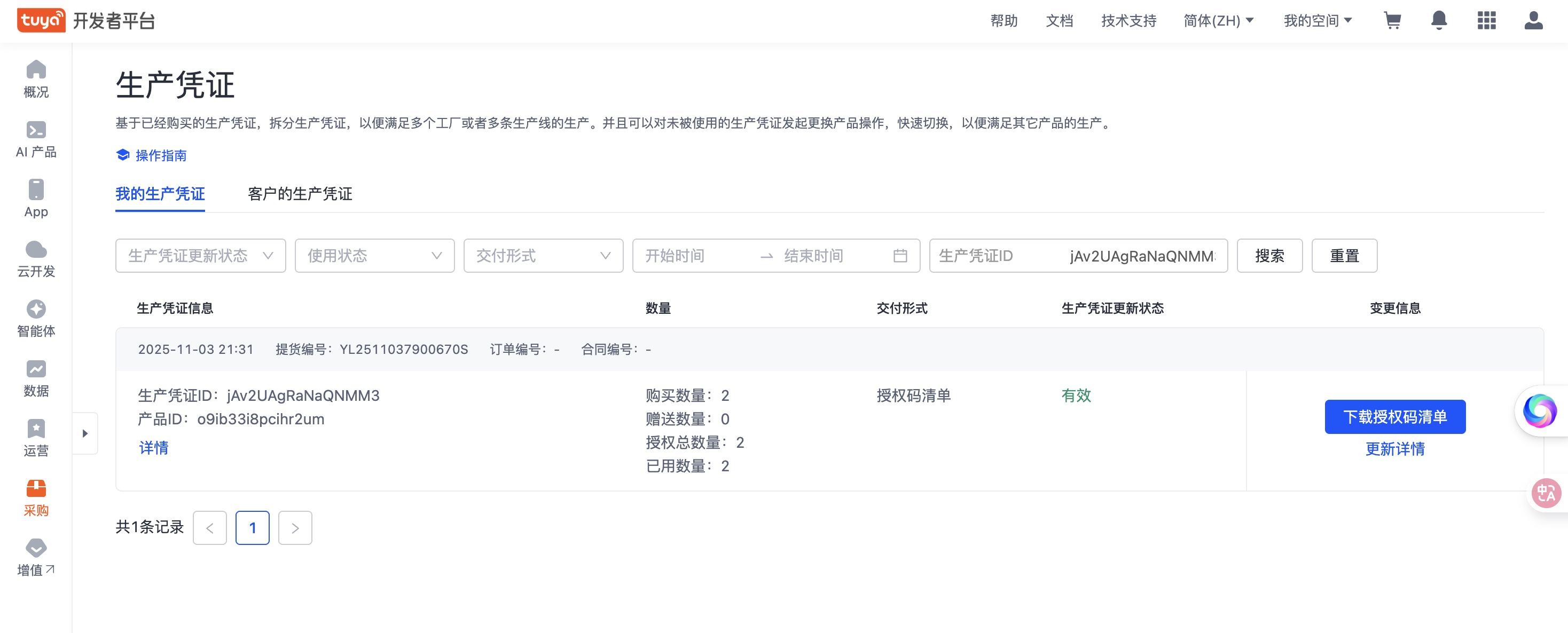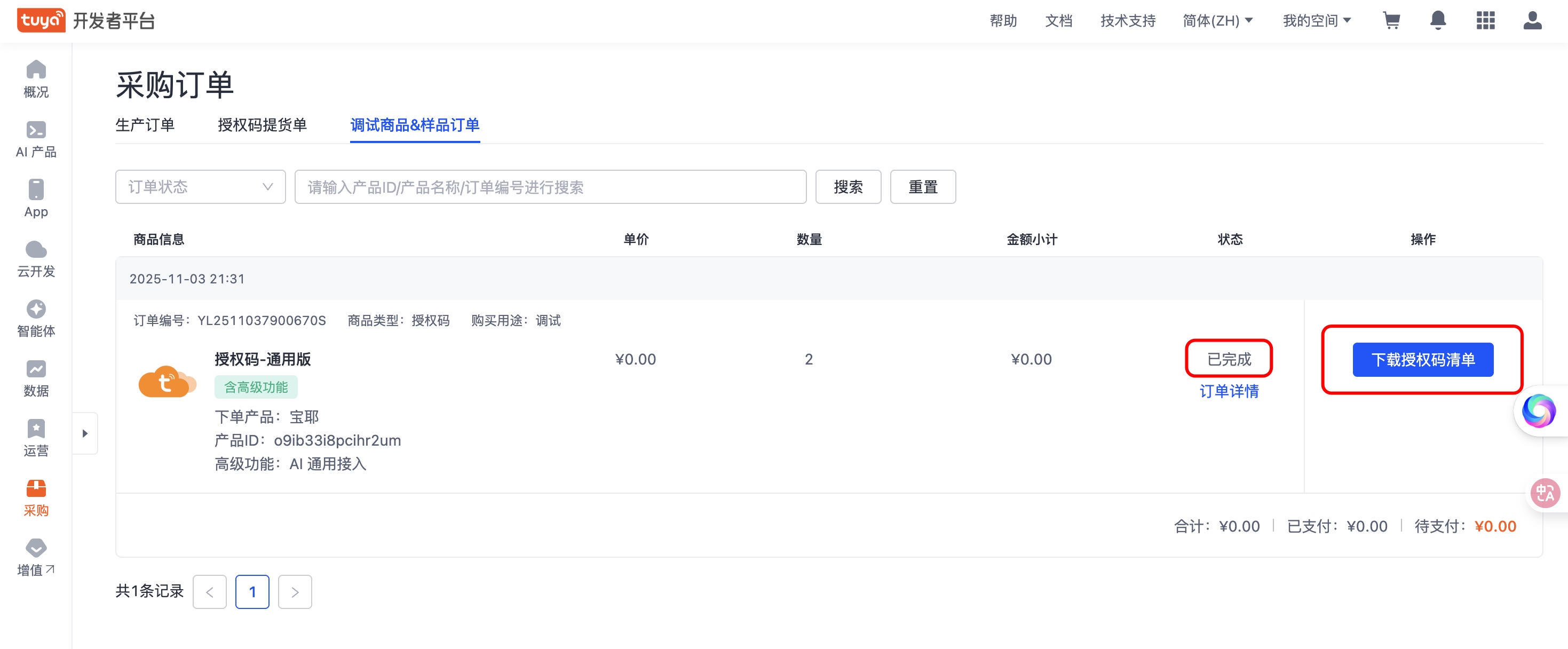 - 刷新页面,查看状态已完成,点击「下载授权码清单」。