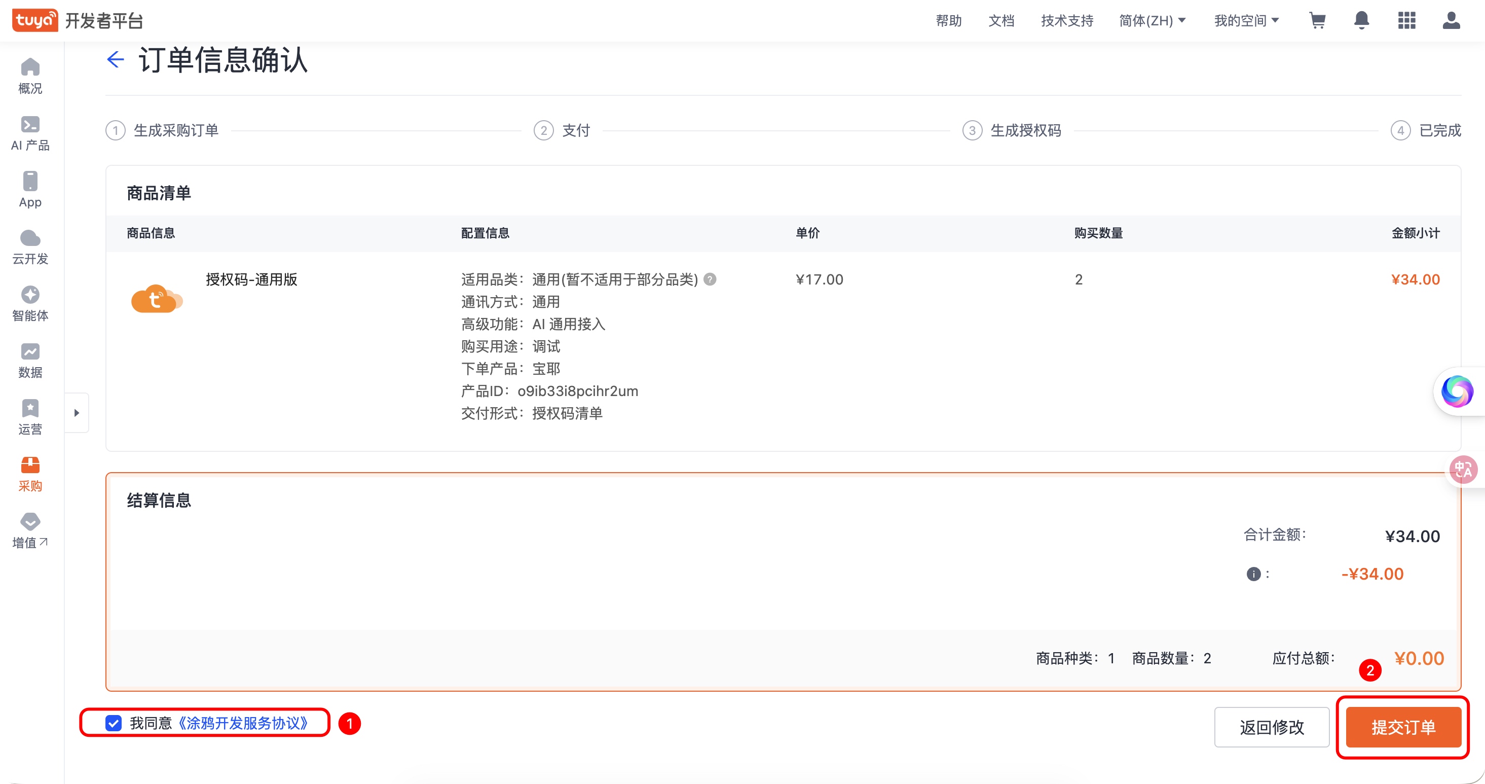 - 确认订单信息,点击「提交订单」。