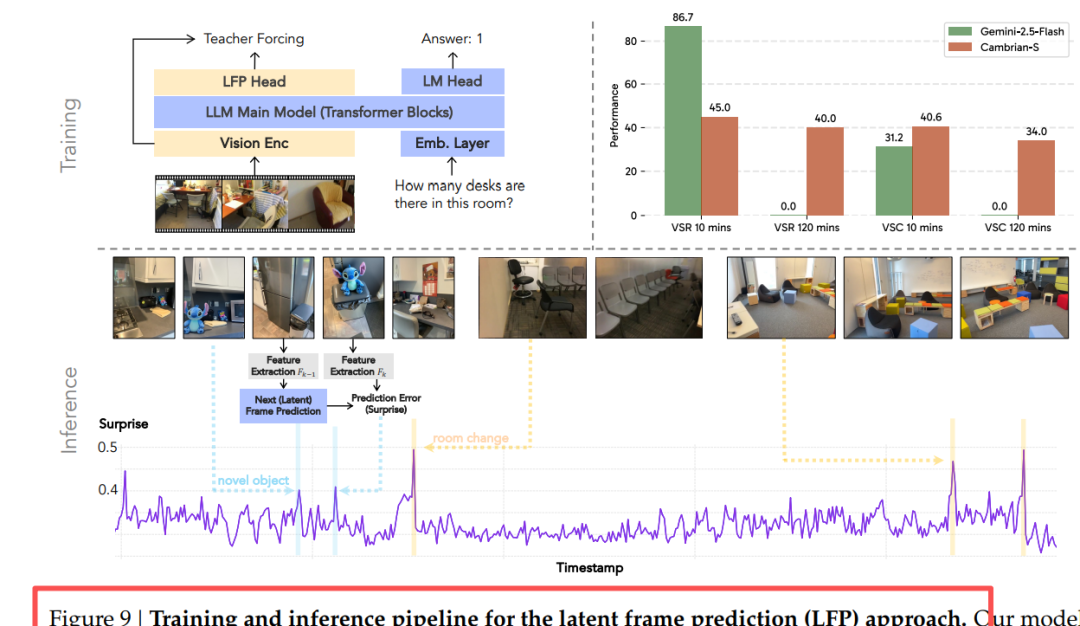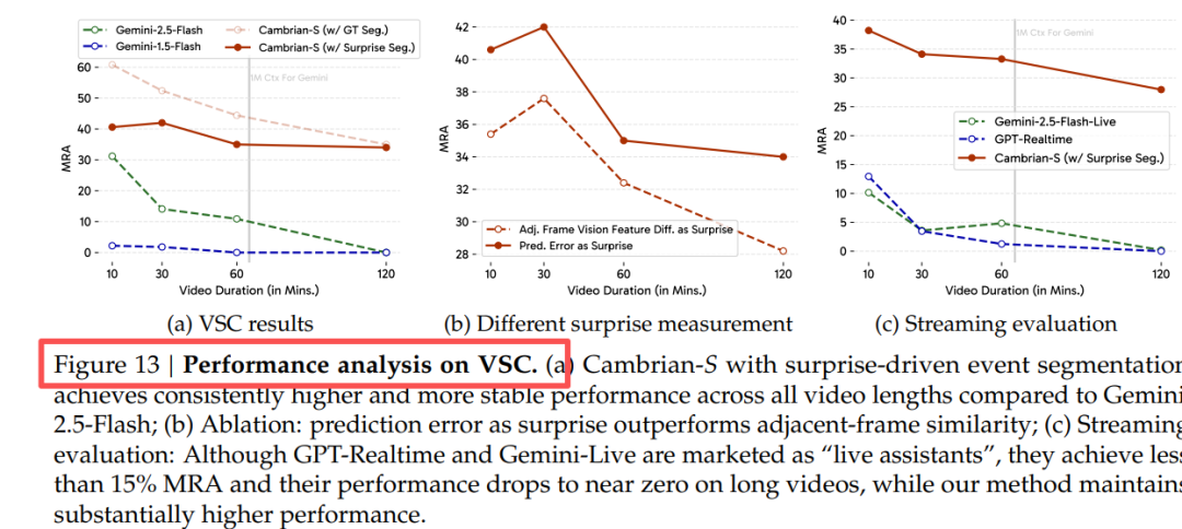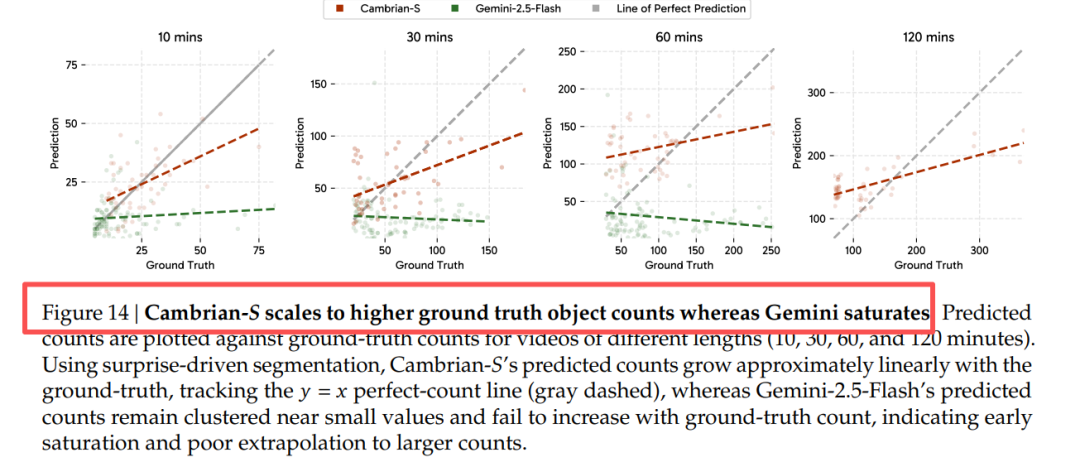 图14的震撼:Gemini-2.5-Flash的预测(橙色)完全不跟随真实值(蓝色),而Cambrian-S(绿色)呈现正相关。这证明**“惊讶度"机制让AI学会了"如何学习”**,而非死记硬背。