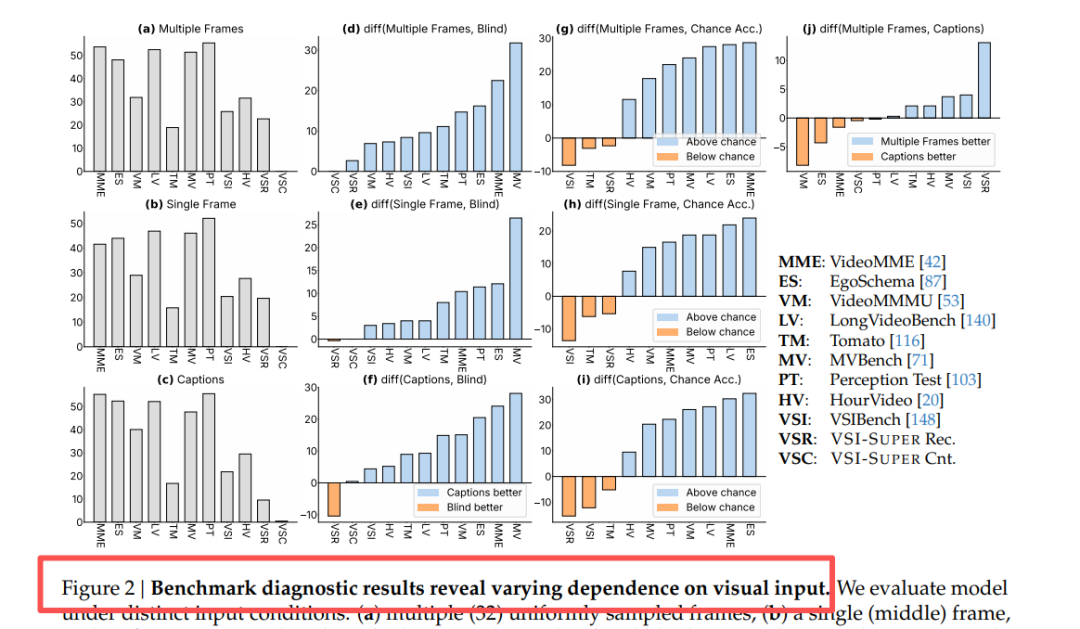 图2解读:当"多帧"性能与"帧字幕"差不多时(右图差值接近0),说明该基准不需要真正的视觉感知。大多数主流基准都沦陷了,只有VSI-Bench和Tomato考验真实视频理解能力。