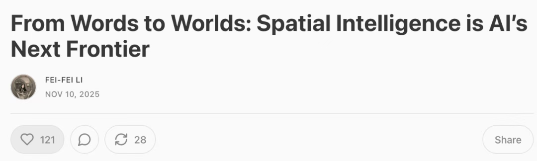 空间智能,https://drfeifei.substack.com/p/from-words-to-worlds-spatial-intelligenceCambrian-S: Towards Spatial Supersensing in Videohttps://arxiv.org/pdf/2511.04670