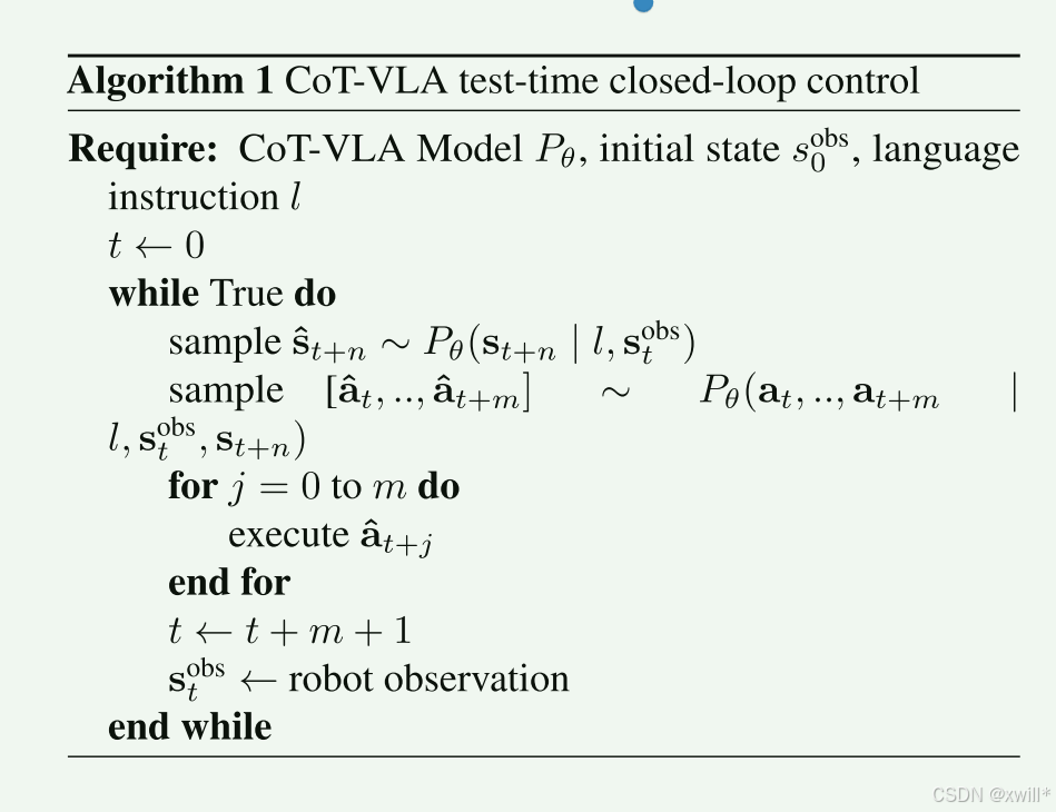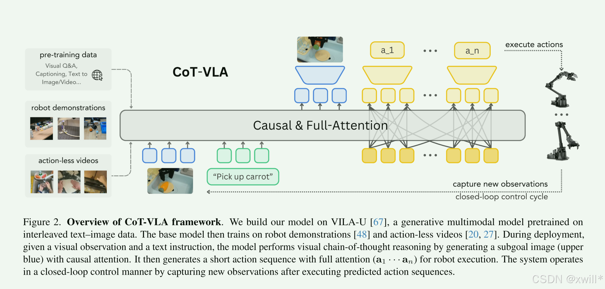 提出CoT-VLA:把视觉-语言-动作模型和思维链结合,通过引入中间视觉目标(subgoal images)作为显式推理步骤,与传统用或关键点的抽象表示不同,使用视频中采样的子目标图像,既可解释又有效,基于VILA-U模型构建,在多种机器人操作上表现较好。但是也存在计算开销大,视觉质量欠佳(自回归图像生成不如扩散模型),动作分块导致动作可能不连续(这一个动作片段和下一个动作片段不连续),视觉推理泛