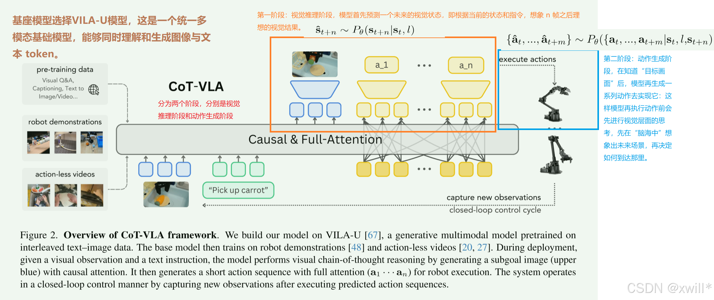 如何让机器人也具有向日一样的思考过程,在执行前一步的时候,思考下一步在画面应该是啥很么样。这就是视觉思维链。让VLA模型也能够做到先想像再行动。