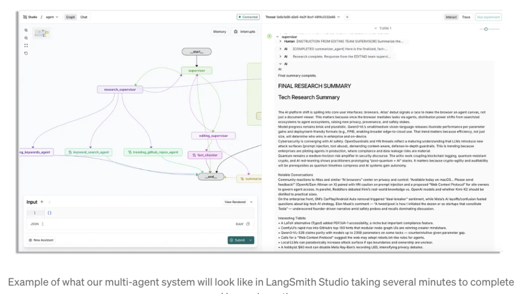 我第一次在 LangSmith Studio 里看到我的多智能体系统“开工”的时候,真的有点震撼——好几个 Agent 在“互相对话”,协作完成一篇科技新闻摘要。整个流程跑完大概 3 分钟,比单智能体慢一点,但输出质量完全不在一个层次上。