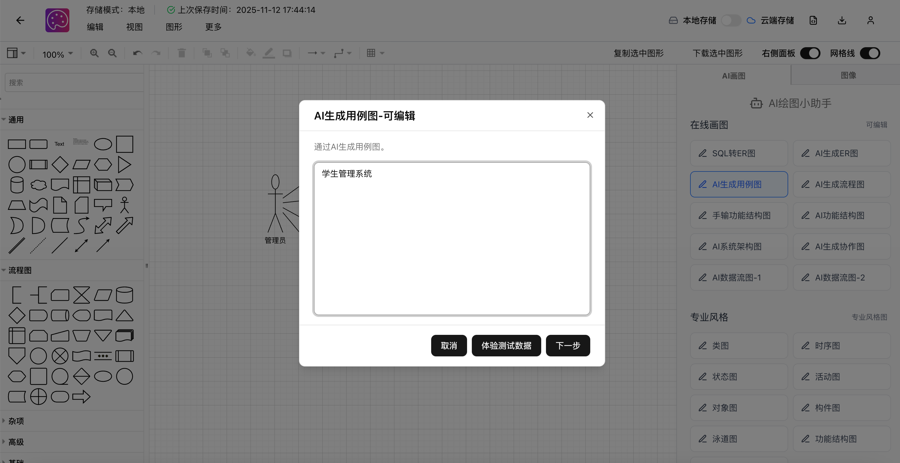 AI 智能生成用例图功能的操作极其简单,即使是没有任何专业绘图技能的小白用户,也能轻松上手。用户无需学习复杂的绘图软件操作技巧,也无需掌握专业的 UML(统一建模语言)知识。