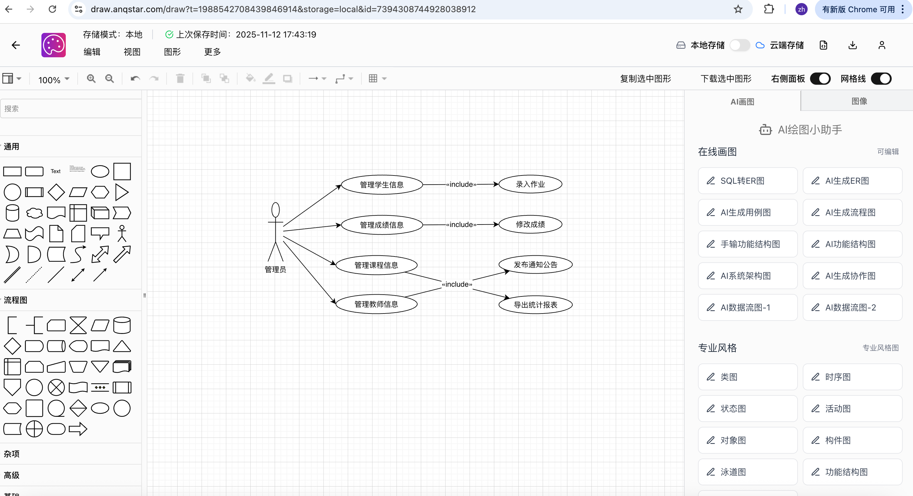 在实践环节,该功能极大地提高了学生的项目开发效率和质量。无论是课程设计、毕业设计还是参与实际的企业项目,学生都可以借助 AI 智能生成用例图,快速完成项目的需求分析和用例图绘制工作,将更多的时间和精力投入到项目的核心开发和优化中。这不仅有助于学生按时完成项目任务,还能提升项目的整体质量,增强学生在就业市场上的竞争力。