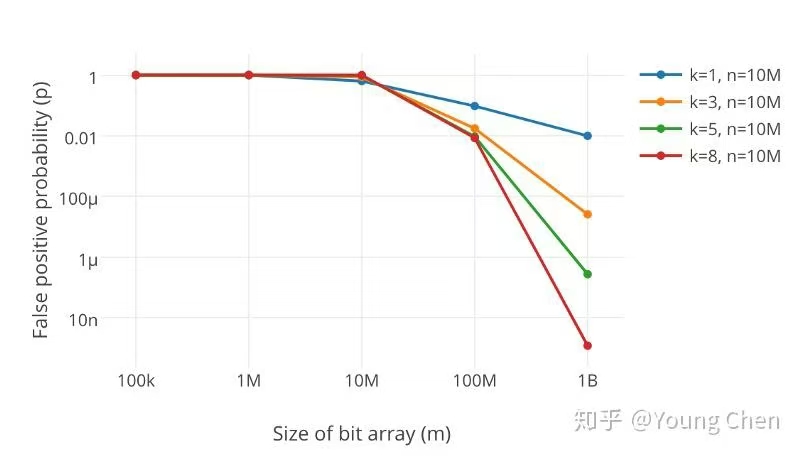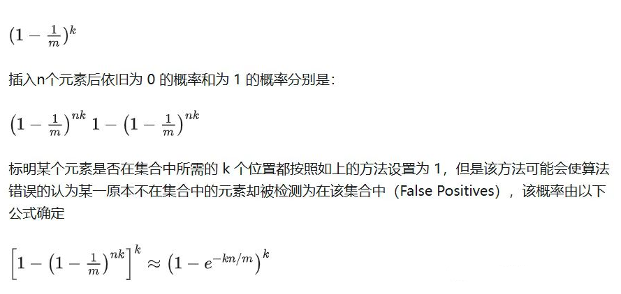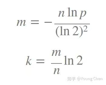 k 为哈希函数个数,m 为布隆过滤器长度,n 为插入的元素个数,p 为误报率。