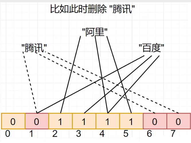 当我们删除腾讯的时候,把1,6,7位置都设为0,百度也有映射为1的位置,那么再查找百度的时候就会判断百度也不存在。