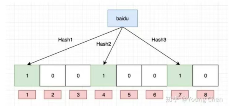 向布隆过滤器插入“baidu”,我们使用多个不同的哈希算法来生成多个哈希值,映射到不同的位置上面。