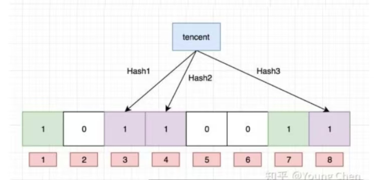 这里我们可以发现插入“baidu”和“tencent”这两个生产出的哈希值都存在4,所以不同的值通过哈希函数求出来的哈希值是会冲突的,当插入的值多了之后,比如我们又插入一个“bit”,假设bit的3个映射位为1,4,8,这三个位置的位置上面都置为1,所以就会存在误判,布隆过滤器是降低误判概率,而不是没有误判,所以对于一个元素的映射的位置如果都为1,我们只能说它可能存在,如果映射的位置有一个不为1,