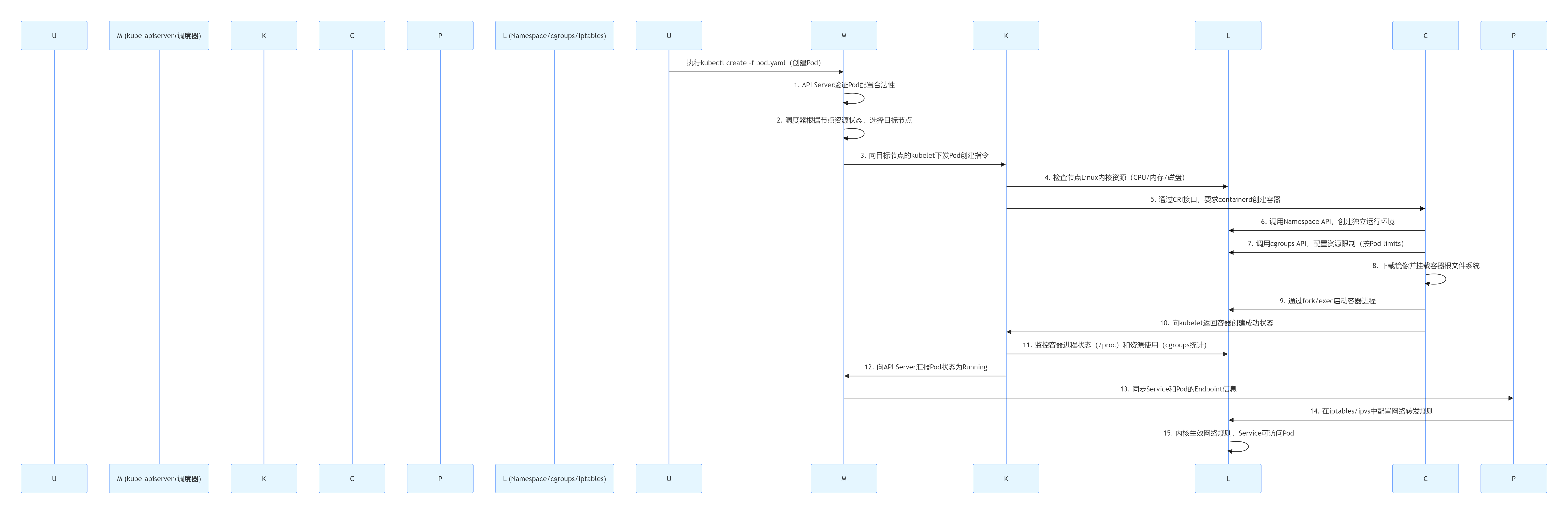 下面用 Mermaid 时序图,还原从执行kubectl create -f pod.yaml到 Pod 在节点上成功运行的全流程,每个环节都标清组件交互和 Linux 的参与点: