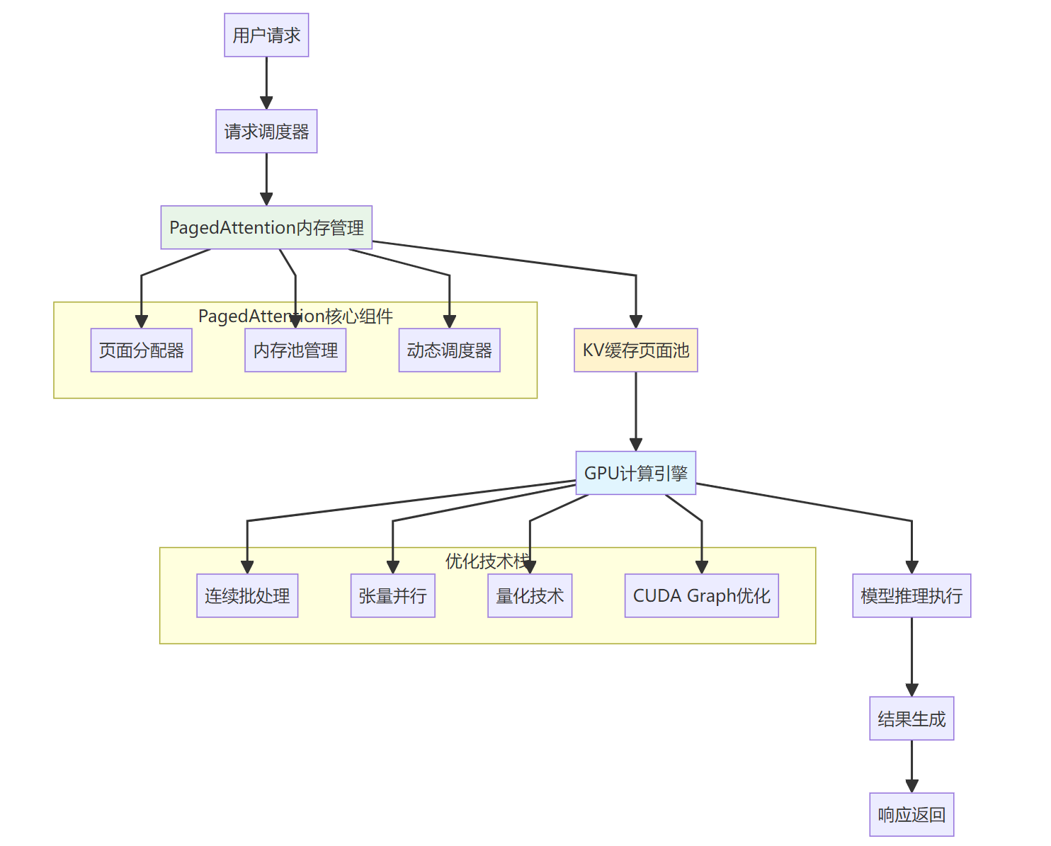 PagedAttention内存管理: 这是vLLM的核心创新,包含页面分配器、内存池管理和动态调度器三个关键组件。页面分配器负责按需分配内存页面,内存池管理维护可用页面的状态,动态调度器根据实时情况调整内存分配策略。