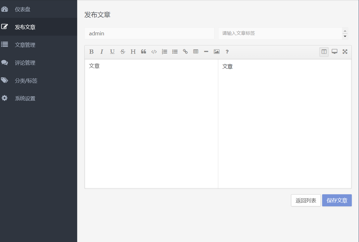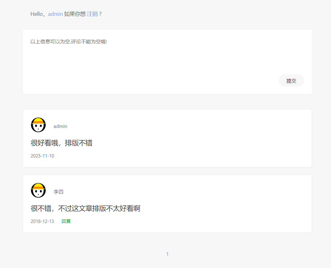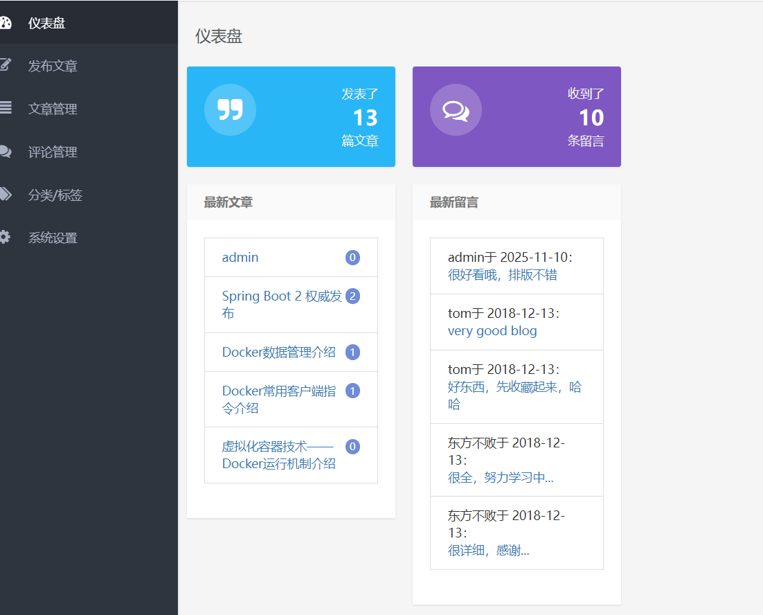 页面包括:登录页、后台管理页(仪表盘、文章管理、评论管理、分类/标签、系统设置)、文章发布页、文章列表页、评论列表页等。