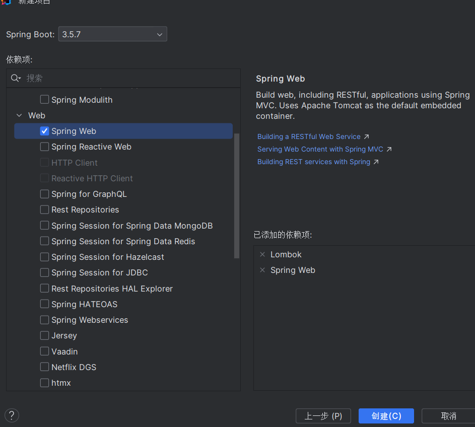 4. 点击 “Next”,在选择依赖对话框中,根据需要选择相应的依赖项,如 Spring Web、Spring Data JPA 等,然后点击 “Finish” 完成项目创建。