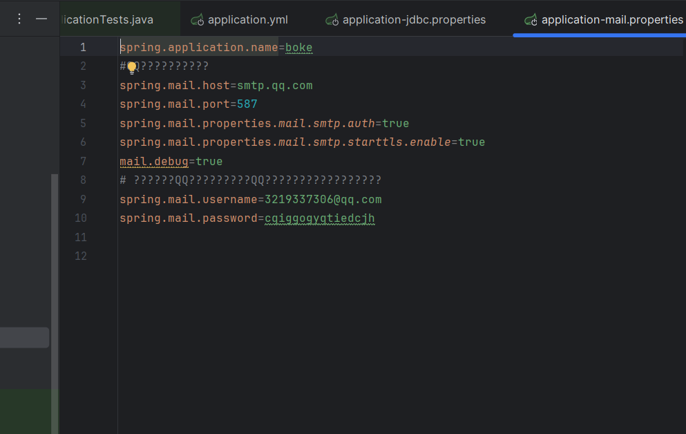 配置邮件(QQ邮箱):图片中显示了邮件配置,包括host、port、username、password等。