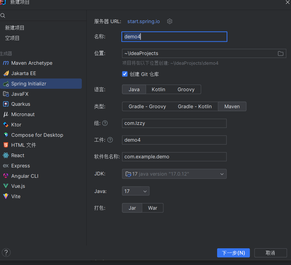 3. 进行基本项目配置,包括服务器 URL、项目名称、位置、语言、类型、组、工件、软件包名称、JDK、Java 版本、打包方式等。
