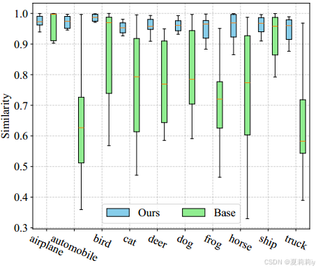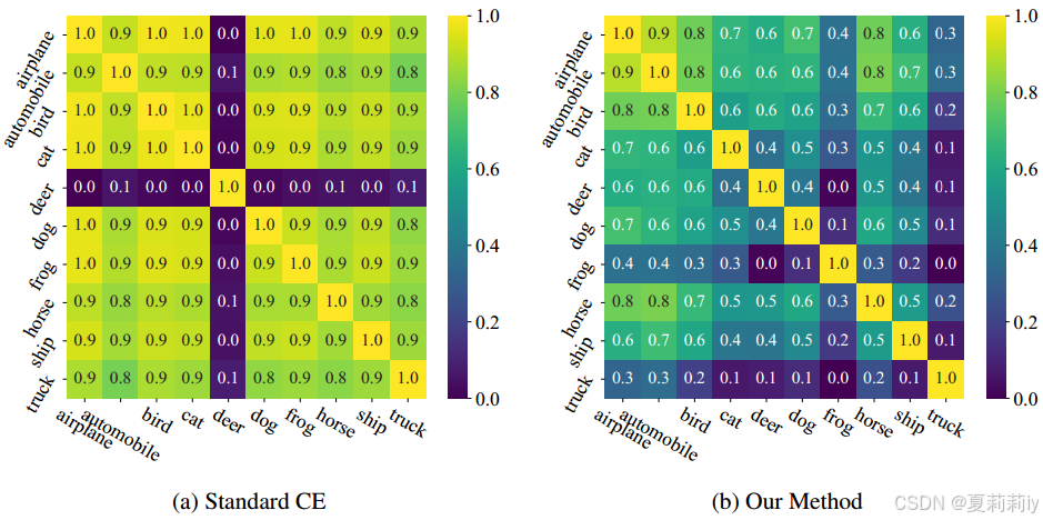①CIFAR-10-LT上原始的类间相似性和作者约束后的: