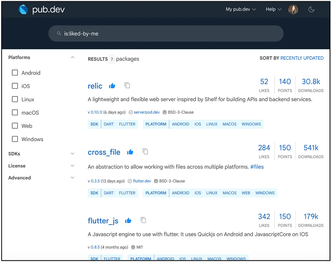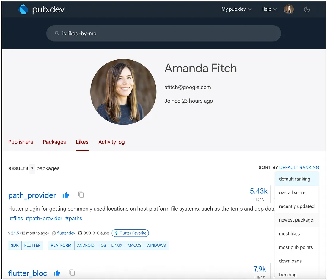 在 pub.dev 上管理收藏的软件包的功能迎来了重大升级,现在可以通过搜索功能或个人资料中的 Likes tab 进行管理, 可以使用与常规搜索相同的熟悉控件来搜索、排序和筛选收藏的软件包。