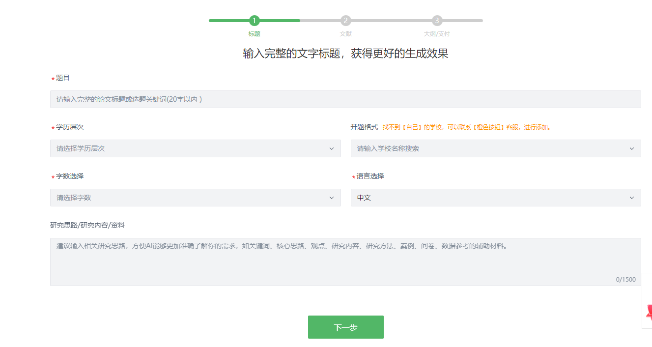 - 输入论文标题或关键词(20字以内),选择学历层次(本科/硕士/博士)。