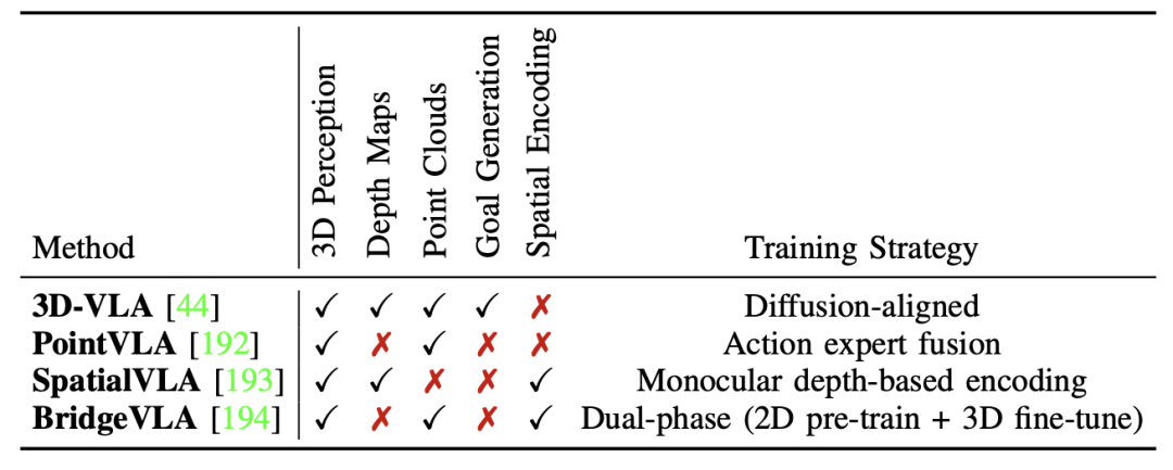 - 空间信息丰富的输入模态:如表所示,一些研究通过整合空间信息丰富的模态(例如深度图和 3D 点云)来增强 VLA 模型的空间理解能力。这些额外的输入弥补 2D 视觉数据的局限性,后者通常缺乏推理 3D 空间物理交互所需的几何线索。