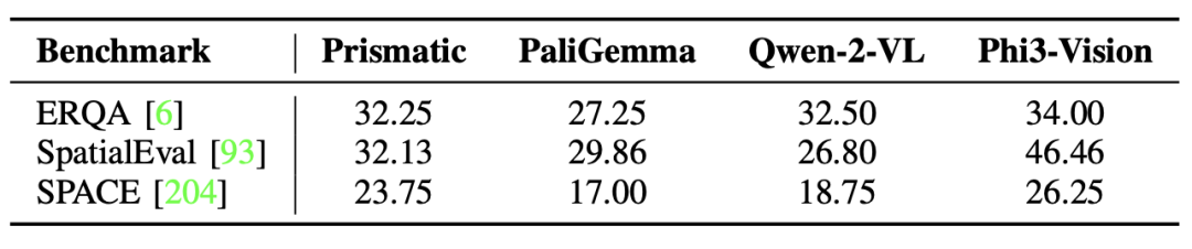 - 基于视觉语言主网的多模态空间推理:许多当前的VLA模型都是基于VLM进行微调或直接使用VLM作为骨干网。这些VLA据称能够有效地继承这些预训练模型的先验知识。为了定量评估上游VLM在机器人任务中的潜力,收集已在VLA中使用的开源VLM,并在与具身场景相关的空间推理基准测试中对它们进行评估。