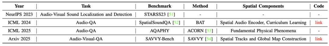 音频空间推理是指从声音中解读空间线索(例如到达方向、声源位置和距离)以推断听觉场景的物理环境的过程。虽然人类听众能够轻松地利用双耳线索定位和区分声音,但当前的多模态大语言模型(MLLM)主要关注听到的内容,而非声音的来源[226]。这种空间感知能力的缺失限制诸如视听导航和以自我为中心的感知等应用,在这些应用中,人工智体必须推断声音的来源才能有效地与环境交互。为了弥补这一差距,近期的研究[51-54, 226, 227]开始探索空间推理能力,通过训练能够从纯音频或视听输入中学习的大规模多模态模型来实现。