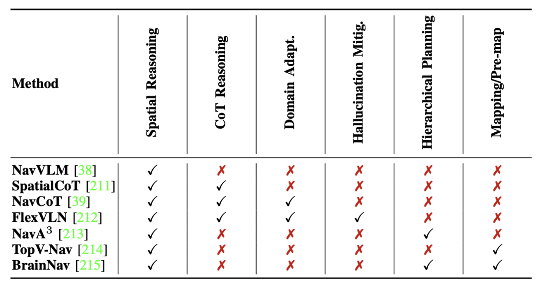- 视觉环境理解和泛化:对于VLN智体而言,感知和解释周围环境、预测行为如何改变环境以及将感知和决策与自然语言指令保持一致至关重要。这需要理解空间布局、在三维空间中确定自身位置、估计目标和地标之间的距离、保留空间信息以及跟踪环境随时间的变化。这些能力共同依赖于强大的空间推理能力,而强大的空间推理能力是成功完成复杂的视觉语言导航任务的基础。