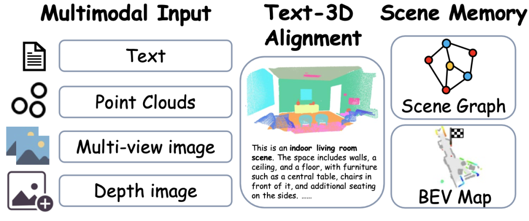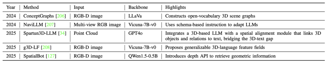 现有的具身场景感知方法通常依赖于 3D 或 2.5D 数据来增强空间感知,如表所示。为了更好地利用视觉输入,许多方法通过多视图感知、深度图像或场景图显式地保留空间特征。