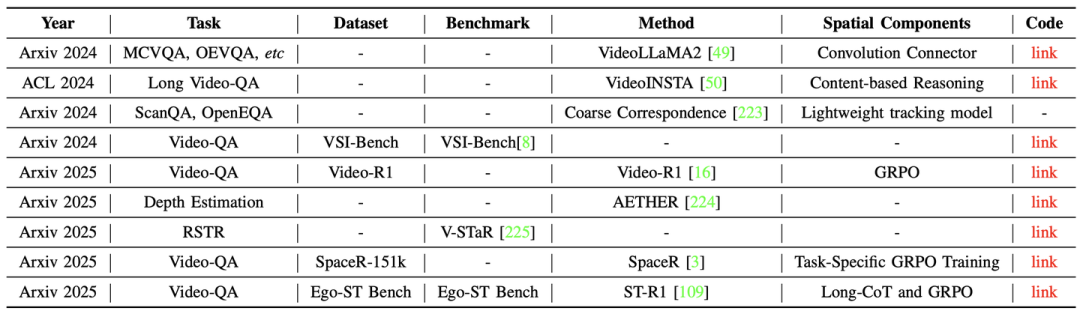 视频本身比静态图像能捕捉到更多场景信息,因此,对 MLLM 的空间推理能力进行大量研究。将推理能力从基于图像的任务扩展到基于视频的理解,开辟令人兴奋的新可能性。然而,在动态、时变的场景中准确推理空间属性并建立对应关系仍然是一个持续存在的挑战。正如 Spatial-R1 [3] 所提出的,该领域需要七项关键的空间推理任务:物体相对距离、物体大小估计、房间大小估计、物体相对方向、物体出现顺序、物体绝对距离和物体计数。