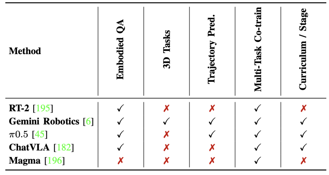 2)多任务预训练和协同训练:增强 VLA 模型空间理解能力的另一个主要方法是修改训练方案,使其包含隐式鼓励空间推理的辅助任务,例如具身问答或 3D 边框检测,如表所示。