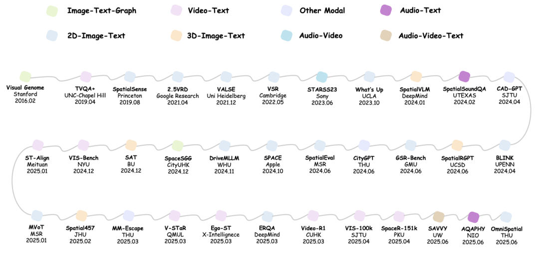 多模态空间推理使人工智能系统能够通过整合来自多种模态(例如视觉和语言)的信息来理解和推断场景中的空间关系。最初,基准测试和数据集侧重于简单的场景和基本的空间关系。然而,随着多模态基础模型的演进,研究重点转向了更复杂的推理和跨模态推断。在这些模型出现之前,研究仅限于具有基本空间任务的环境,例如在视觉问答(VQA)中确定物体的相对位置。随着功能强大的预训练模型的兴起,新的基准测试被开发出来,以应对更大的开放性、更丰富的复杂性和更深层次的推理能力。这些努力涵盖了全景图像、视频、计算机辅助设计(CAD)和地理信息系统(GIS)等领域,推动了人工智能系统在场景理解方面的进步。如图展示多模态空间推理基准测试的发展历程。