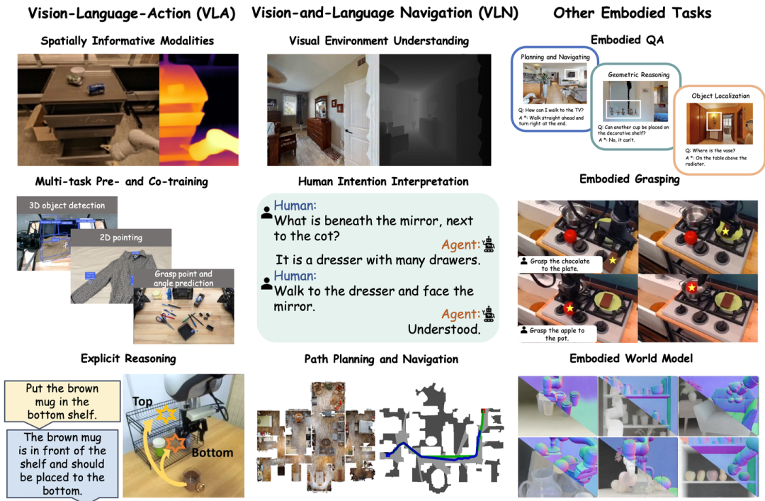 具身人工智能被认为是通往通用人工智能(AGI)的关键途径[185]。多模态语言模型(MLLM)的快速发展使其成为具身智体核心推理模块的理想候选者。具身智体的许多核心智能——例如几何推理、导航和视角转换——都以空间推理能力为基础[186-188]。如图所示基于MLLM的具身智体在当前主流任务(包括视觉-语言-动作(VLA)、视觉-语言-导航(VLN)和其他具身人工智能任务)中的多模态空间推理能力: