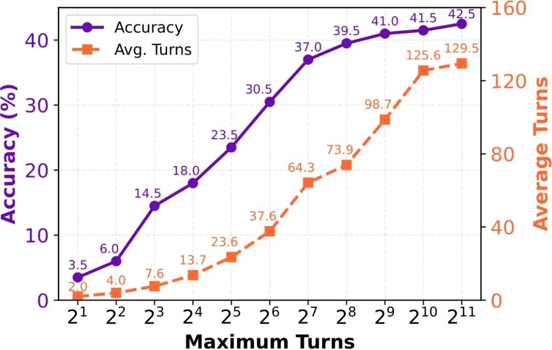 互联网上的关键信息往往密度低、分布散、质量参差;代码问题也常常是"定位难、修起来快"的典型长尾。这意味着 agent 需要反复检索、比对、验证、回溯,不断用工具来缩小不确定性。在这类场景中,更长的交互预算 往往= 更大的探索 or 更多的试错空间,从而带来更高的解题上限。