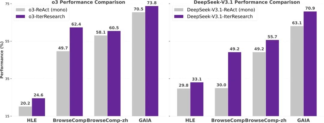 无论是 o3 还是 DeepSeek,二者架构完全不同,却都在使用 IterResearch 提示后显著提升。 这说明该范式触及的是长程推理中的共性瓶颈,而非特定模型的技巧性缺陷。