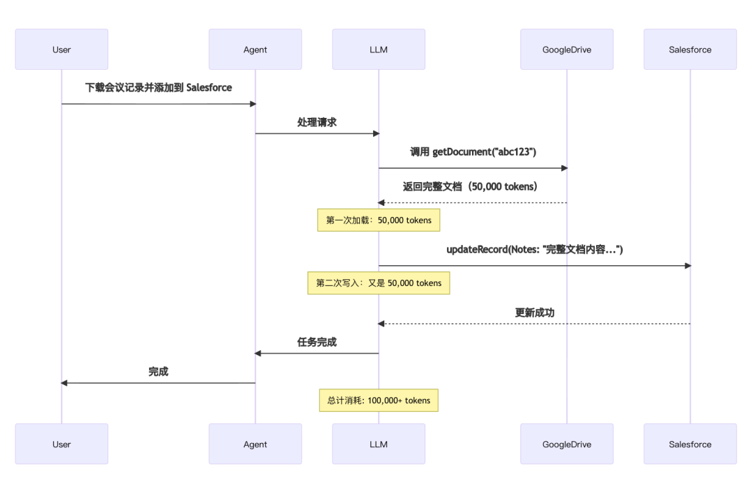 →模型需要将整个记录再次写入上下文(又是50,000 tokens)