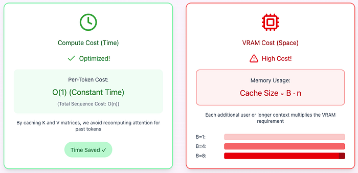 KV 缓存并非“免费的午餐”,而是一种典型的时空权衡:我们消除了冗余计算(时间),但必须把缓存塞进 GPU 显存(空间),而且这块缓存会变得非常非常庞大!