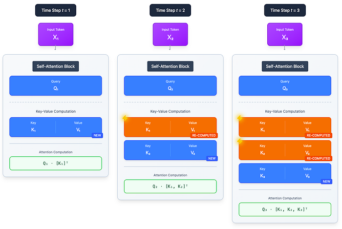 - 我们停止重新计算 K₁…Kₜ₋₁ 和 V₁…Vₜ₋₁