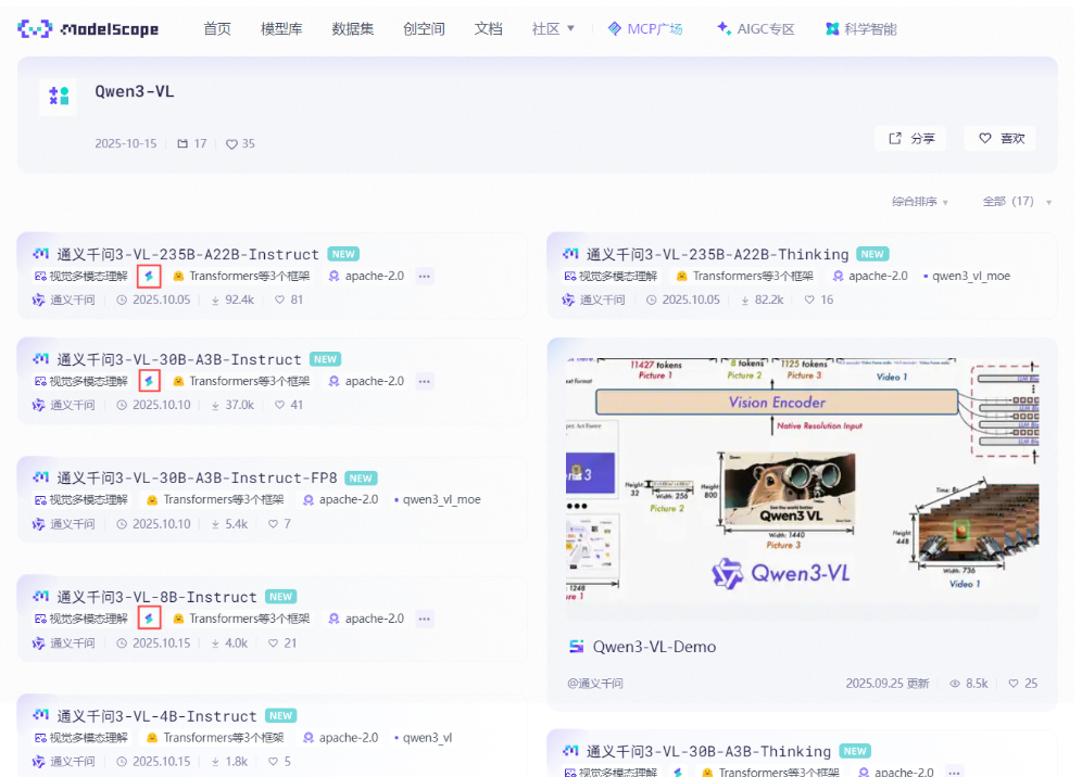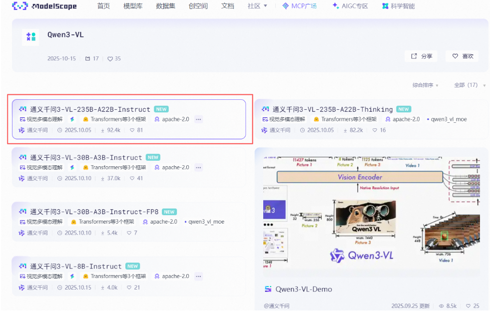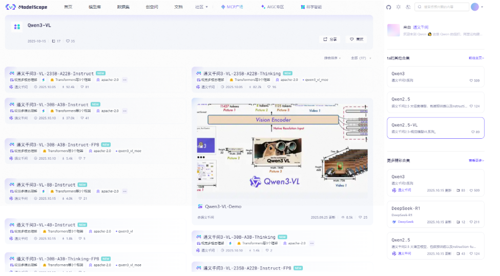 可登录ModelScope魔搭社区查看Qwen3-VL模型合集。